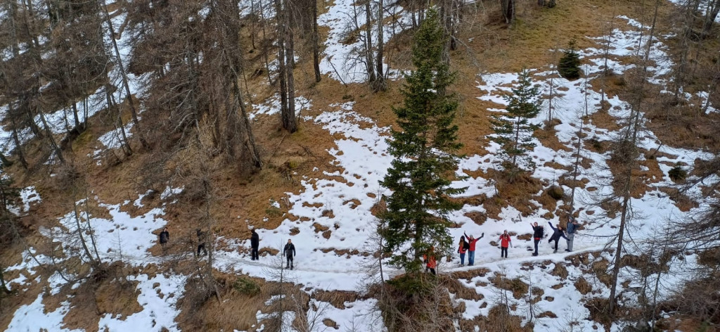 La montée vers le Mont Garnier est plus raide, plus enneigée. Nous avançons sur une belle épaisseur de neige et nous enfonçons parfois jusqu’aux chevilles. Le froid s’accentue… les nuages menacent… nous recevons quelques flocons.